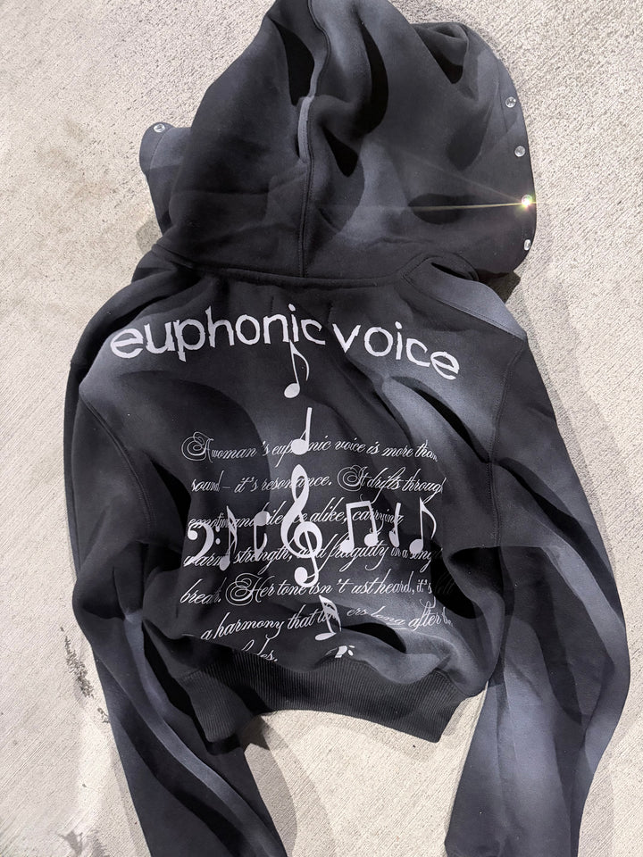 100% French Terry Cotton Hoodie with a white sun fade all around, puff print on the chest, and rhinestones on the hood.